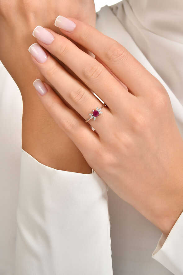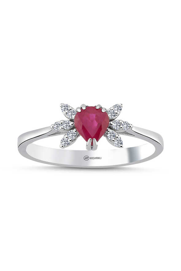0.11 Karat Pırlanta Yakut Yüzük, sade hatları ve zarif taş kesimiyle romantik bir duruş sergiler. 8 ayar beyaz altının parlaklığı, kırmızı yakut taşla bütünleşir.