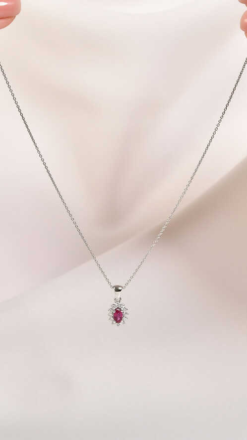 0.11 Karat Pırlanta Yakut Kolye, pırlantanın parlaklığını yakutun sıcak kırmızısıyla buluşturur. 8 ayar beyaz altın formu, taşların ışıltısını zarif biçimde ortaya çıkarır.