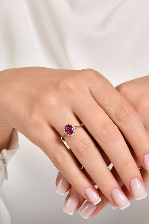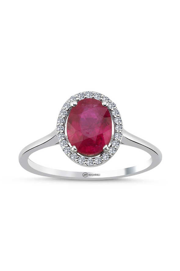 0.11 Karat Pırlanta Yakut Yüzük, sade hatları ve zarif taş kesimiyle romantik bir duruş sergiler. 8 ayar beyaz altının parlaklığı, kırmızı yakut taşla bütünleşir.