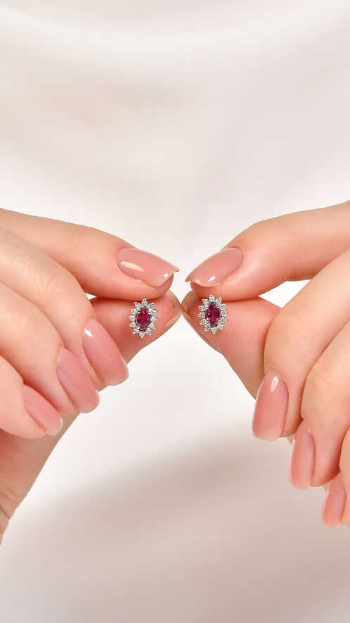 0.19 karat pırlanta yakut küpe, kırmızının tutkusunu pırlantanın zarafetiyle buluşturur. 8 ayar beyaz altın montür, taşların parlaklığını vurgulayarak asil bir görünüm kazandırır. Hem özel günlerde hem günlük kullanımda zarafet sunar.