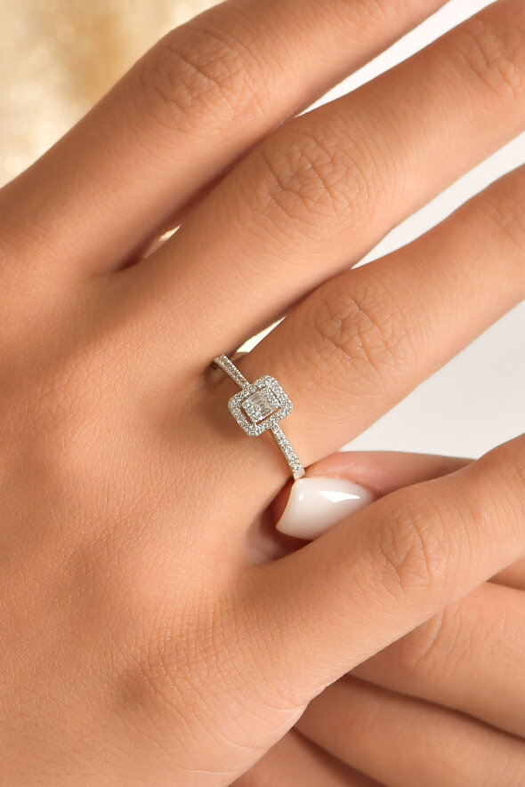 0.24 karat pırlanta baget yüzük, zarif taş dizilimiyle modern bir duruş sergiler. 14 ayar beyaz altınla işlenmiş bu model, pırlantanın parlaklığını ön plana çıkararak sofistike bir görünüm sunar.