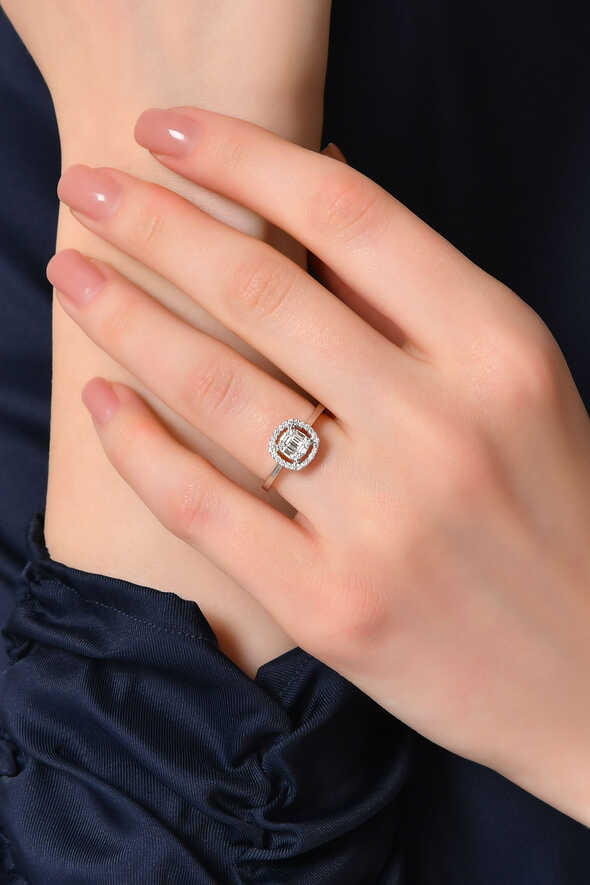 0.29 karat pırlanta baget yüzük, geometrik taş dizilimiyle klasik zarafeti modern bir çizgiyle buluşturur. 14 ayar beyaz altın yapısı, pırlantaların parlaklığını ön plana çıkararak göz kamaştırıcı bir etki yaratır.