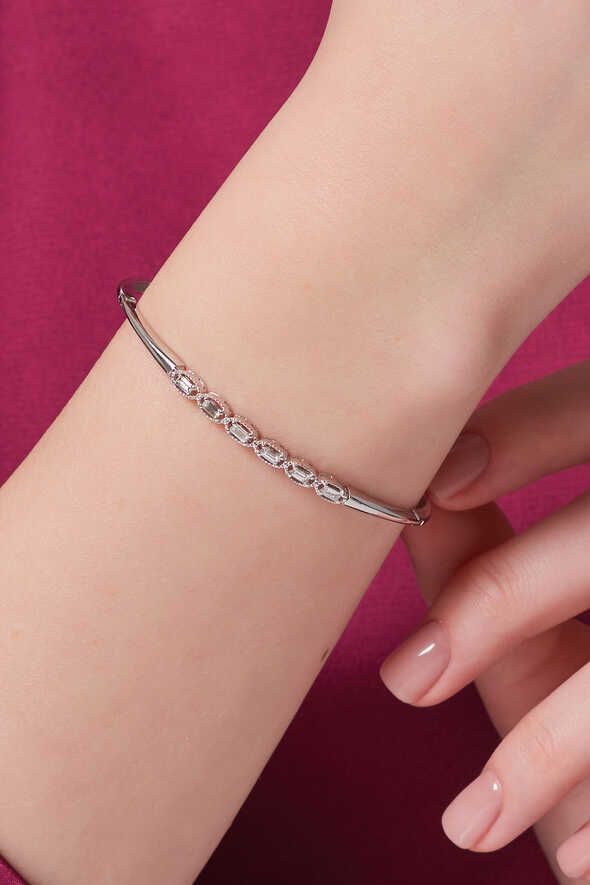 Pırlanta baget bileklik, zarif çizgileri ve modern formuyla ışıltılı bir şıklık sunar. 14 ayar beyaz altın üzerine yerleştirilen 0.32 karat pırlantalar, baget kesimiyle ışığı kusursuz biçimde yansıtır. Günlük zarafetten özel davet şıklığına kadar her ortamda sofistike bir görünüm kazandırır.