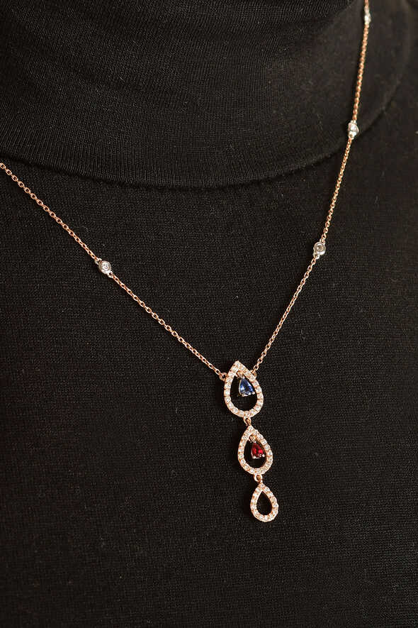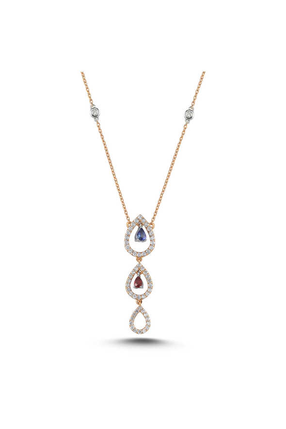 0.47 Karat Pırlanta Safir Kolye, renkli safir taşlarının enerjisini pırlantanın ışıltısıyla birleştirir. 14 ayar rose altın formu, sıcak tonlarıyla modern bir zarafet sunar.