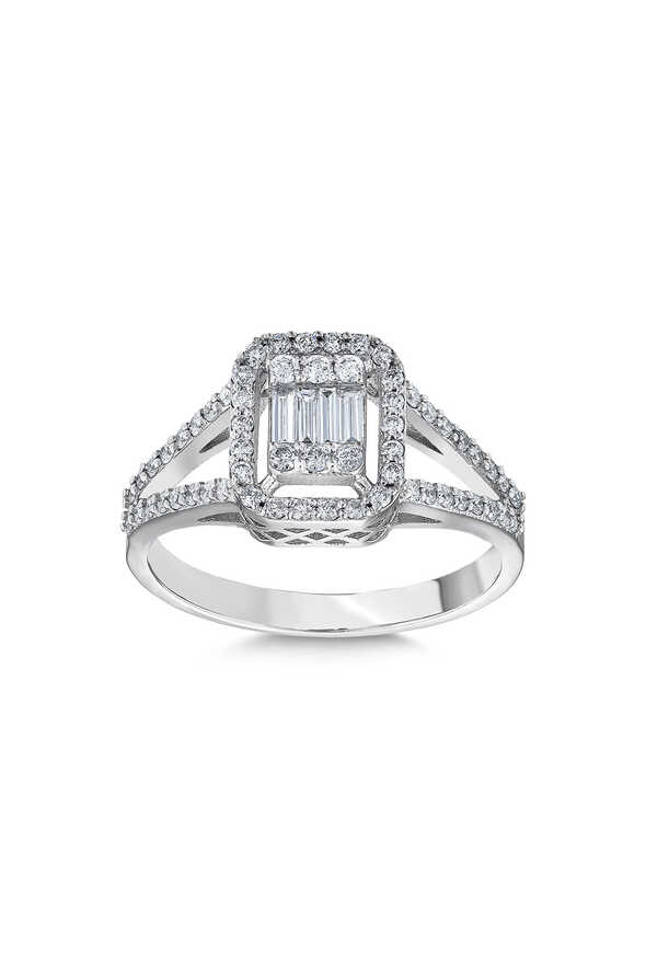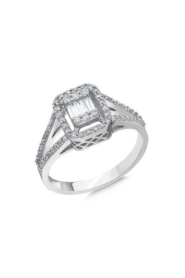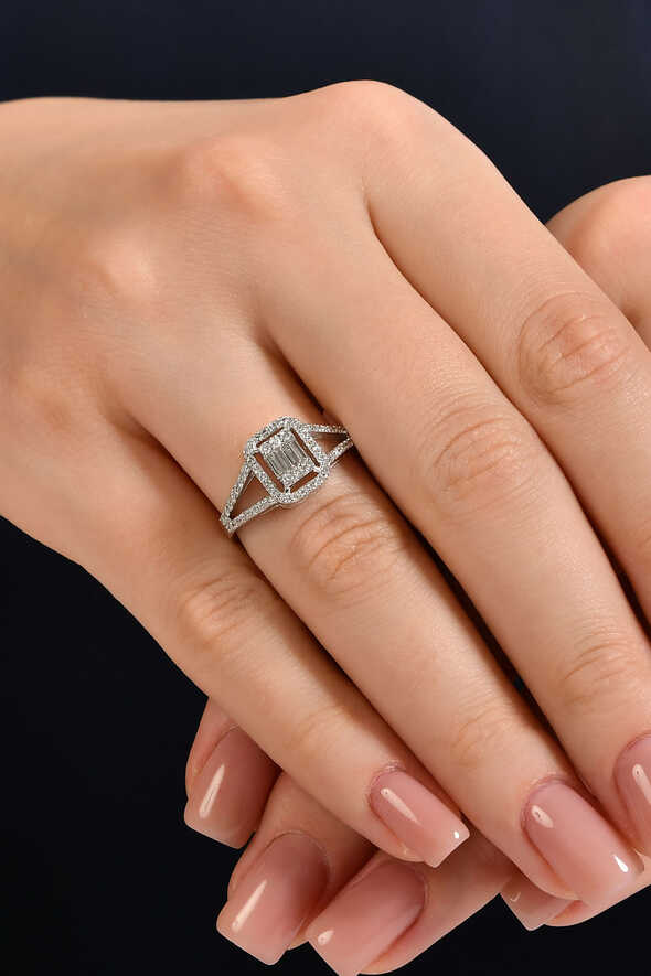 0.49 Karat Pırlanta Baget Yüzük, modern hatları ve zarif ışıltısıyla göz kamaştırır. 14 ayar beyaz altının parlak yüzeyi, pırlantanın geometrik formuyla birleşerek klasik ve modern tarzı bir araya getirir.
