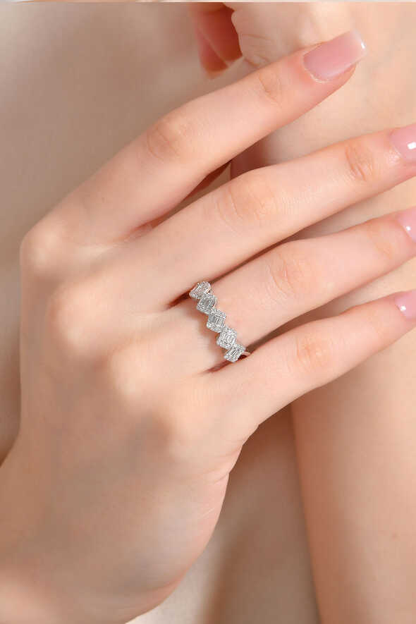 0.55 Karat Pırlanta Baget Yüzük, ışıltısı ve dengeli formuyla göz alıcı bir zarafet sunar. 14 ayar beyaz altının parlak yüzeyi, baget pırlantaların modern çizgileriyle birleşerek zamansız bir şıklık oluşturur.