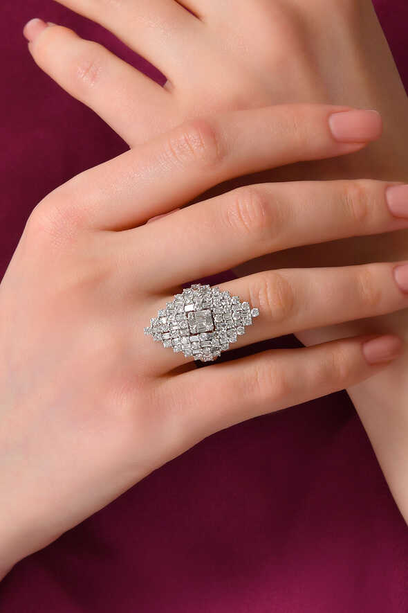 3.17 Karat Pırlanta Tasarım Yüzük, kusursuz işçiliği ve yoğun ışıltısıyla lüksün en zarif halini temsil eder. 14 ayar beyaz altının zarif formu, üç karatın üzerindeki taşlarla büyüleyici bir etki yaratır.