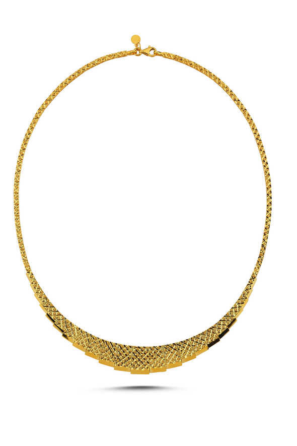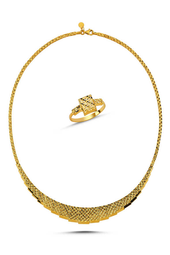 Altın ikili set, 22 ayar sarı altının asaletini zarif tasarımıyla buluşturur. Gerdanlık ve yüzük kombinasyonu, şıklığı ve geleneksel zarafeti bir arada sunar. Her dönem modası geçmeyen bir yatırım ve stil parçasıdır.
