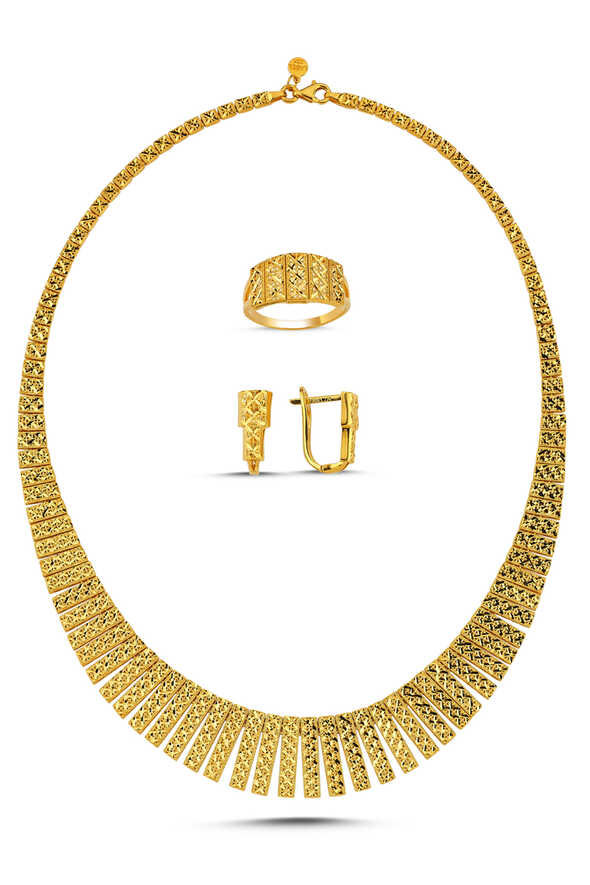 Saf altının göz alıcı zarafetini yansıtan bu altın üçlü seti hemen sipariş edin; klasik ışıltınızı her zaman taşıyın.