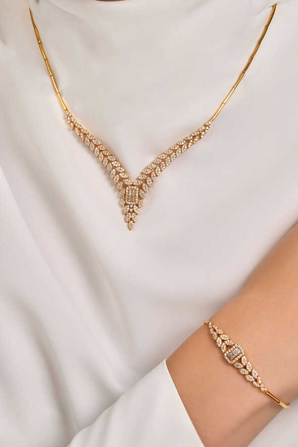 Göz alıcı uyumuyla öne çıkan bu 22 ayar baget taşlı altın seti hemen sipariş edin.