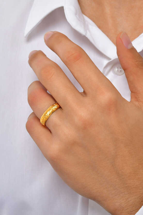 Desenli altın alyans, 22 ayar altının göz alıcı parlaklığı ile modern dokulu yüzeyin birleşimini sunar. 3,54 gram ağırlığı ile elde dengeli bir duruş sergilerken, gün boyu rahat kullanım sağlar. Özel tasarım yüzey desenleri, alyansa farklı bir karakter kazandırır ve klasik modellerden ayrılmasını sağlar.