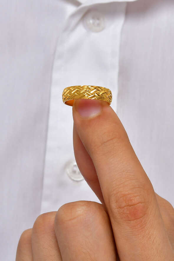 Geleneksel desenleriyle şıklığı buluşturan bu 22 ayar desenli altın alyansı hemen sipariş edin; sevginizi klasik zarafetle taçlandırın.