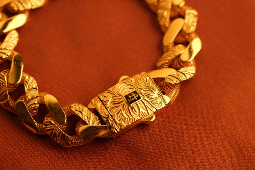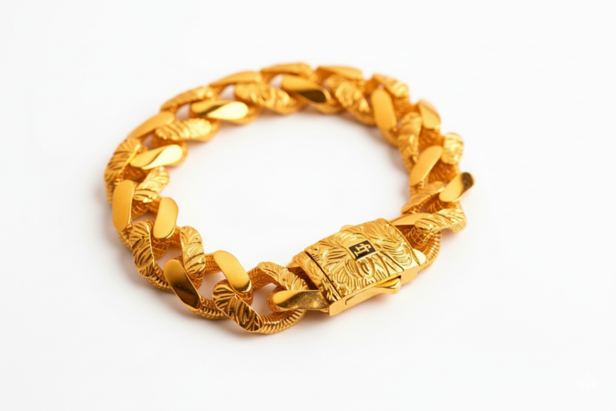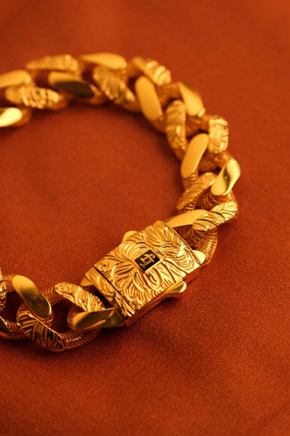 Gurmet model altın bileklik, klasik zincir formlarının en güçlü temsilcisidir. 22 ayar altının saf parlaklığıyla tasarlanan bu model, yoğun işçilikle elde üretilir. 40.44 gram ağırlığıyla bilekte dolgun ve dikkat çekici bir duruş sergiler. Kalın, keskin kenarlı halkalarıyla güçlü bir karakter yansıtırken, parlak yüzey dokusu ve detaylı klips tasarımıyla lüksü vurgular. Hem yatırım hem de prestij unsuru olarak tercih edilir.