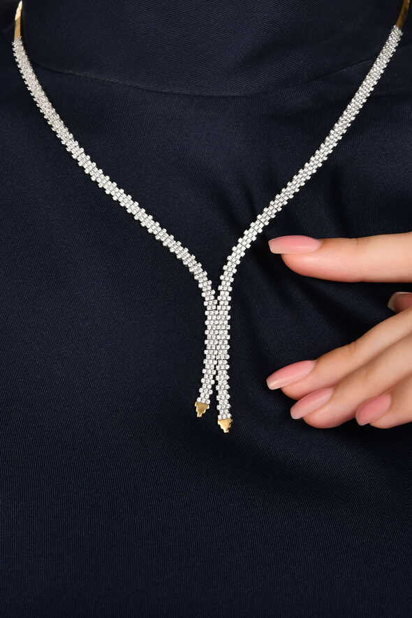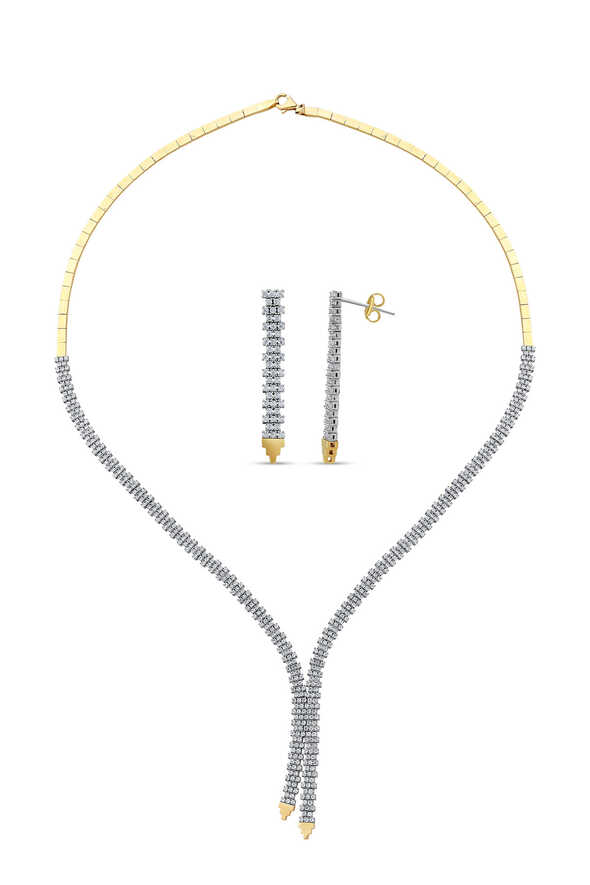 İki renkli altın üçlü set, beyaz ve sarı altının zarif birleşimiyle klasik şıklığı modern detaylarla buluşturur. 14 ayar altından üretilen bu set, kolye ve küpe kombinasyonu ile göz alıcı bir bütünlük sağlar. Düğün, nişan veya özel davetlerde mükemmel bir tercihtir.