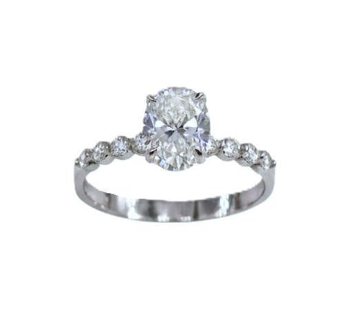 Işıltısıyla göz kamaştıran bu kolu taşlı 14 ayar beyaz altın oval yüzüğü hemen sipariş edin, zarafeti parmağınızda hissedin.