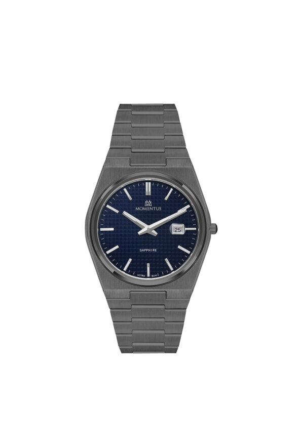Lacivert kadran, sade indekslerle birleşerek sofistike bir görünüm sunar. Safir cam ve yansıma önleyici kaplama, çizilmeye karşı yüksek direnç ve gün boyu net okunabilirlik sağlar. Momentus üretim standardını yansıtan bu yapı, estetik ve dayanıklılığı bir araya getirir.