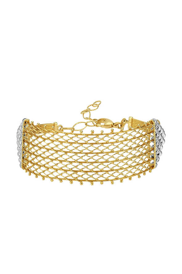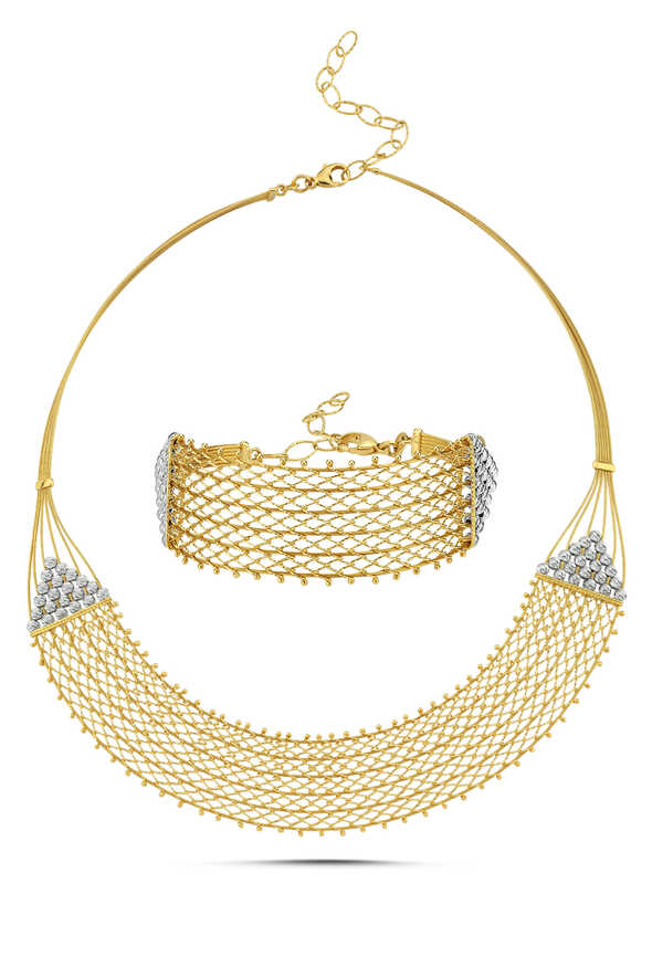 Örgülü altın ikili set, el işçiliğinin zarafetini yansıtan klasik bir tasarımdır. 14 ayar sarı altının sıcak tonlarıyla hazırlanan örgü dokulu gerdanlık ve bileklik, hem günlük kullanıma hem de özel günlerdeki şıklığa uyum sağlar. Geleneksel formu modern çizgilerle birleştirerek zamansız bir duruş sergiler.