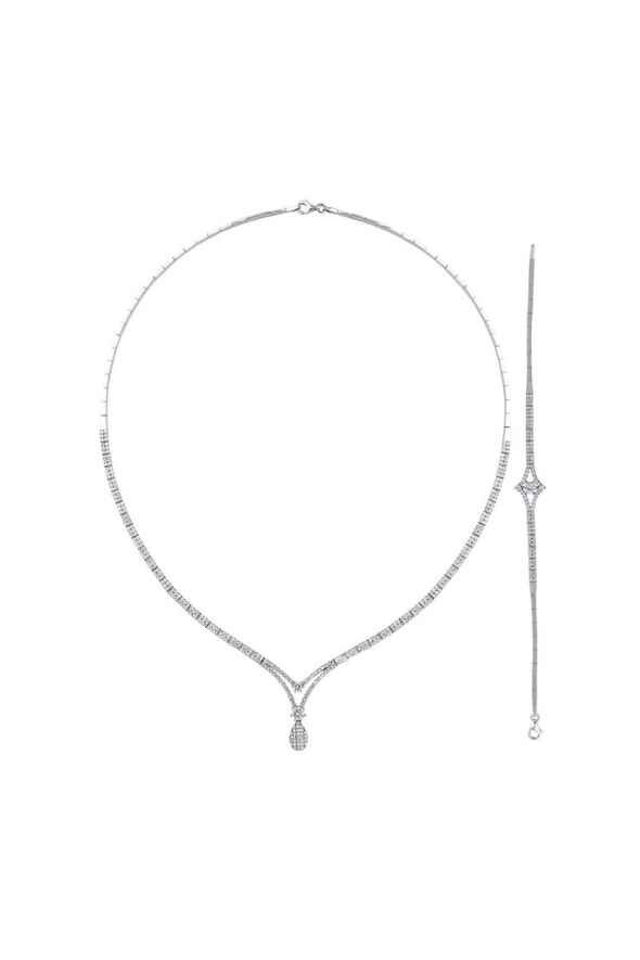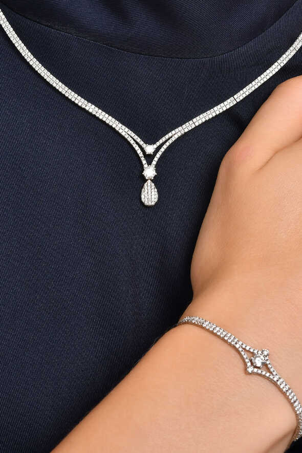 Özel tasarım altın ikili set, modern çizgileriyle zarafeti buluşturan 14 ayar beyaz altın formunda hazırlanmıştır. Kolye ve bileklikten oluşan bu şık kombin, detaylardaki ustalıkla dikkat çeker. Sade ama etkileyici bir duruş arayanlar için mükemmel bir tercihtir.