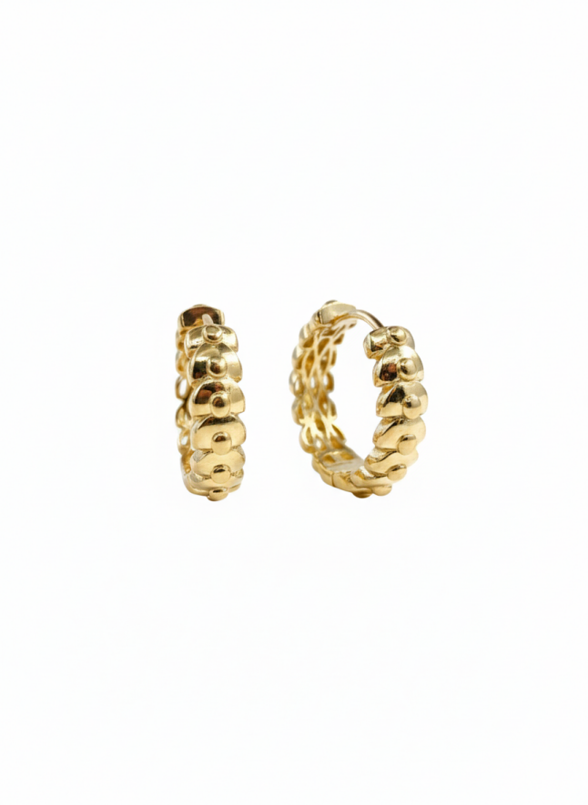Özgün tasarım küpe modeli, klasik halka formuna modern bir dokunuş katarak şıklığı yeniden tanımlar. 14 ayar altınla üretilen bu küpe, 4.71 gram ağırlığıyla günlük kullanıma uygun hafiflikte ve dikkat çekici bir parlaklığa sahiptir. Üç boyutlu formu, her açıdan ışığı yansıtarak zarif bir görünüm sunar.
