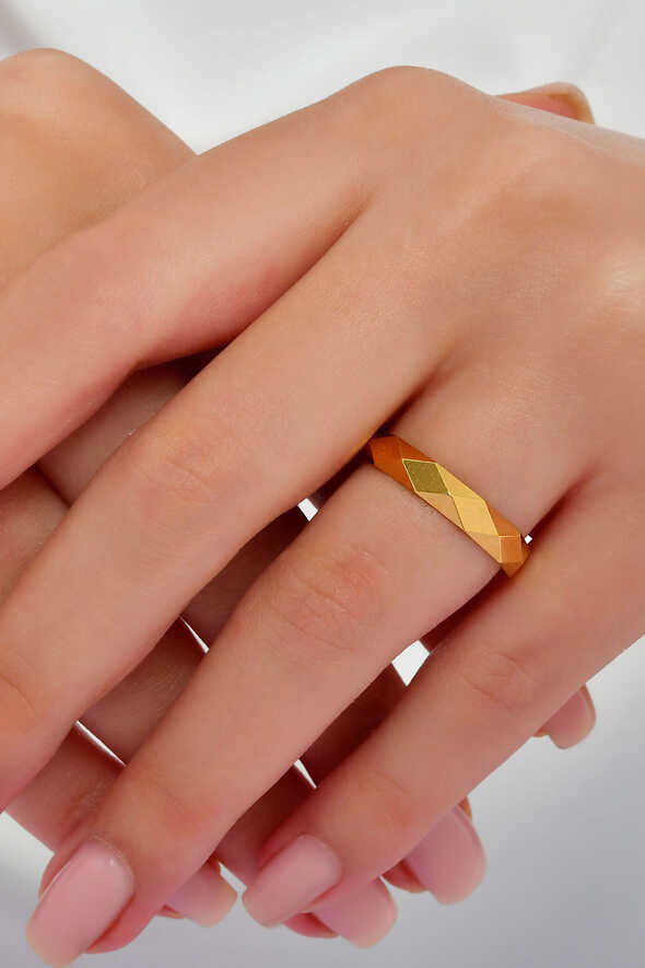 Zarif geometrik detaylarıyla dikkat çeken bu 22 ayar piramit desenli altın alyansı şimdi sipariş edin.