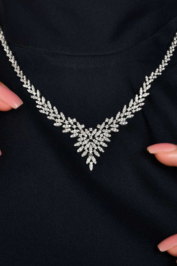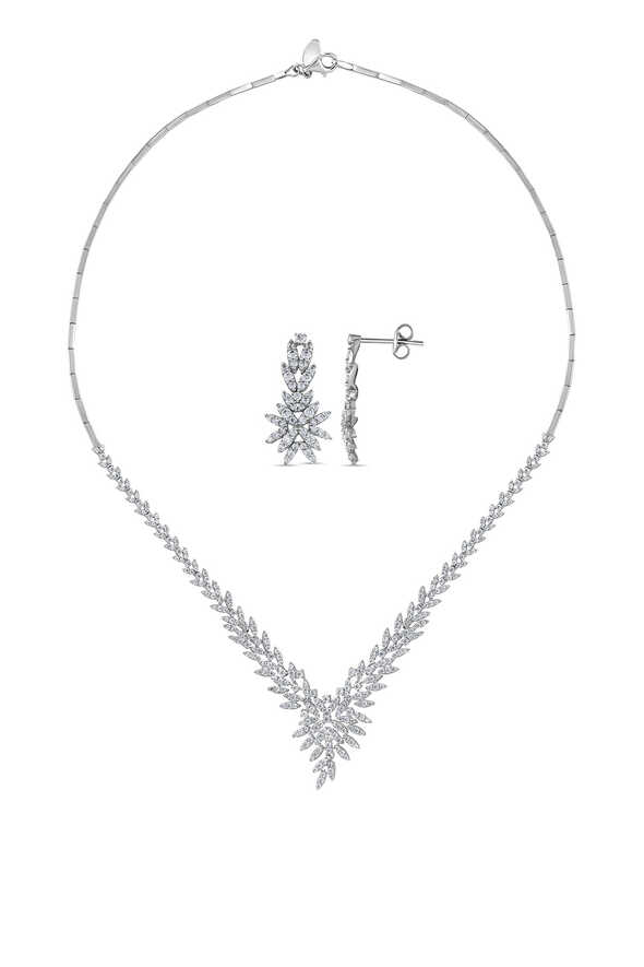 Taşlı altın set, beyaz altının zarif parıltısını ışıltılı taş detaylarıyla buluşturur. 14 ayar altından üretilen bu set, kolye ve küpe kombinasyonuyla özel davetlerin yıldızı olmaya adaydır. Parlak taşlar ışığı kusursuz yansıtarak yüz hatlarını öne çıkarır.