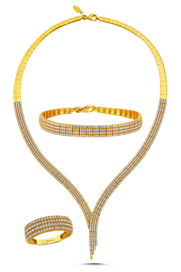 Taşlı altın üçlü set, gerdanlık, bileklik ve yüzükten oluşan zarif bir kombinasyondur. 22 ayar sarı altının sıcak tonları, taş detaylarının ışıltısıyla birleşerek göz kamaştıran bir görünüm sunar. Şıklık ve uyumun bir arada olduğu bu set, özel günlerde asil bir dokunuş sağlar.