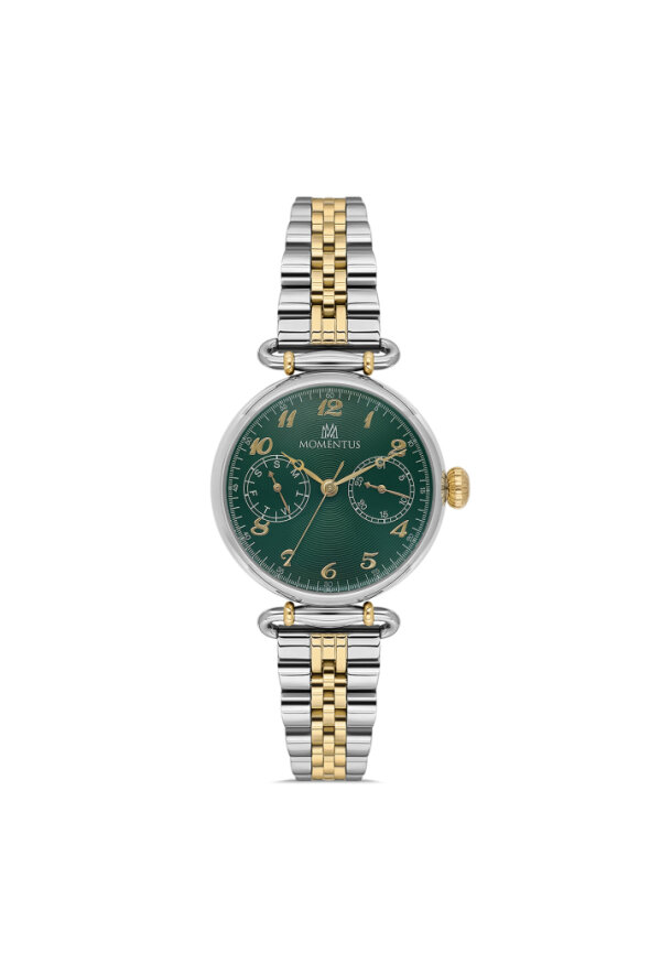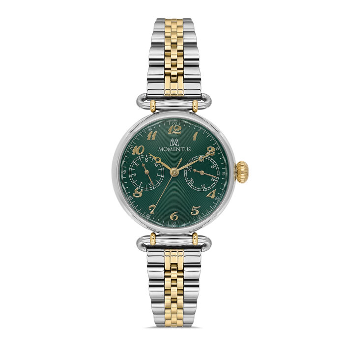 Yeşil kadran, altın tonlu indekslerle birlikte klasik bir zarafet sunar. Bombeli mineral cam, estetik görünümü desteklerken günlük kullanımda yeterli dayanıklılık sağlar. Momentus üretim standardını yansıtan bu detaylar, zarafet ile sağlamlığı dengeler.