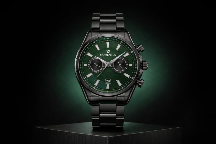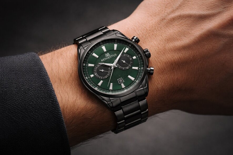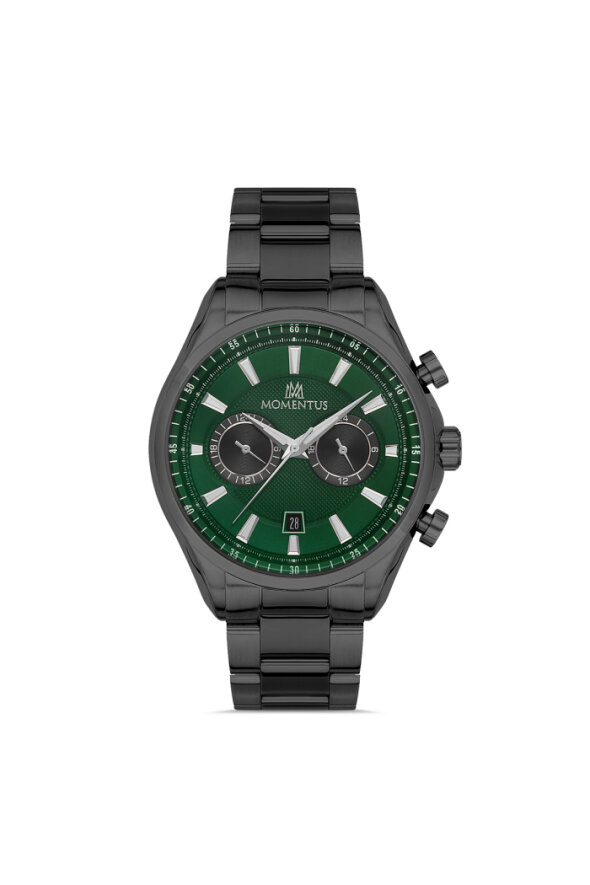 Derin yeşil kadran, bombeli mineral cam ve yansıma önleyici kaplama ile birleşerek her açıdan net bir okuma deneyimi sunar. Momentus üretim standardını yansıtan bu yapı, spor-şık çizgiyi fonksiyonellikle dengeler.
